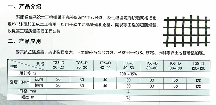 聚酯經(jīng)編滌綸土工格柵采用高強度滌綸工業(yè)長絲,經(jīng)過經(jīng)編定向織造網(wǎng)格坯布,經(jīng)PVC涂覆加工成土工格柵。應用于軟土地基處理和路基、堤壩等工程的加筋增強,以提高工程質(zhì)量降低工程造價。
